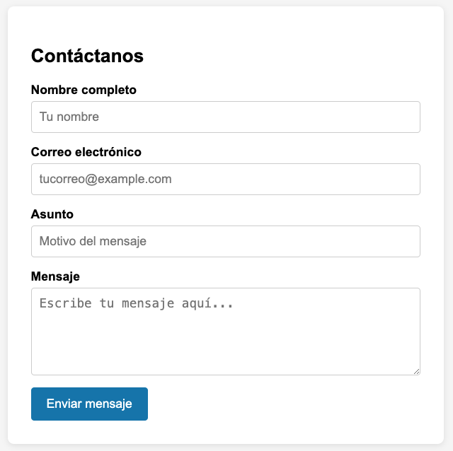 El componente más importante de una página de contacto es el formulario. Es la forma más directa para que un usuario te envíe un mensaje sin necesidad de abrir su correo electrónico.
