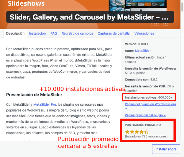 Slider, Gallery, and Carousel by MetaSlider – Image Slider, Video Slider es un ejemplo de plugin con buenas valoraciones.